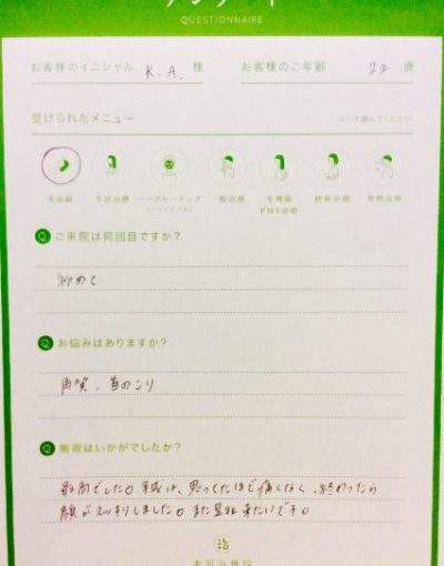 最高でした。鍼は思っていたほど痛くなく、終わったら顔がスッキリしました。また是非来たいです。